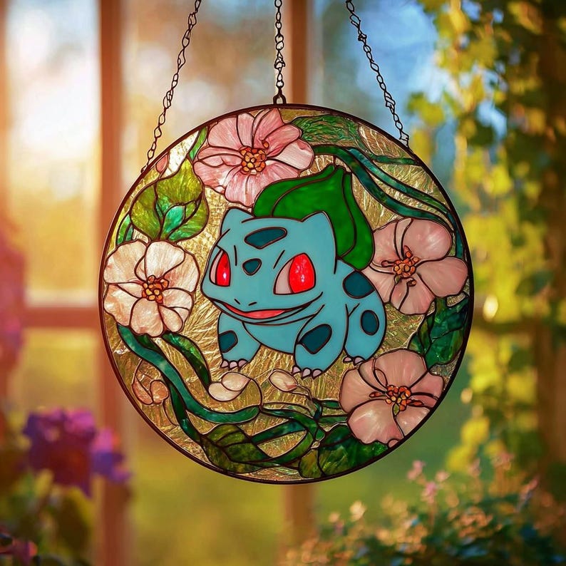 Bulbasaur Stained Glass Suncatcher: Anime Window Hanging, Kids Room Decor
