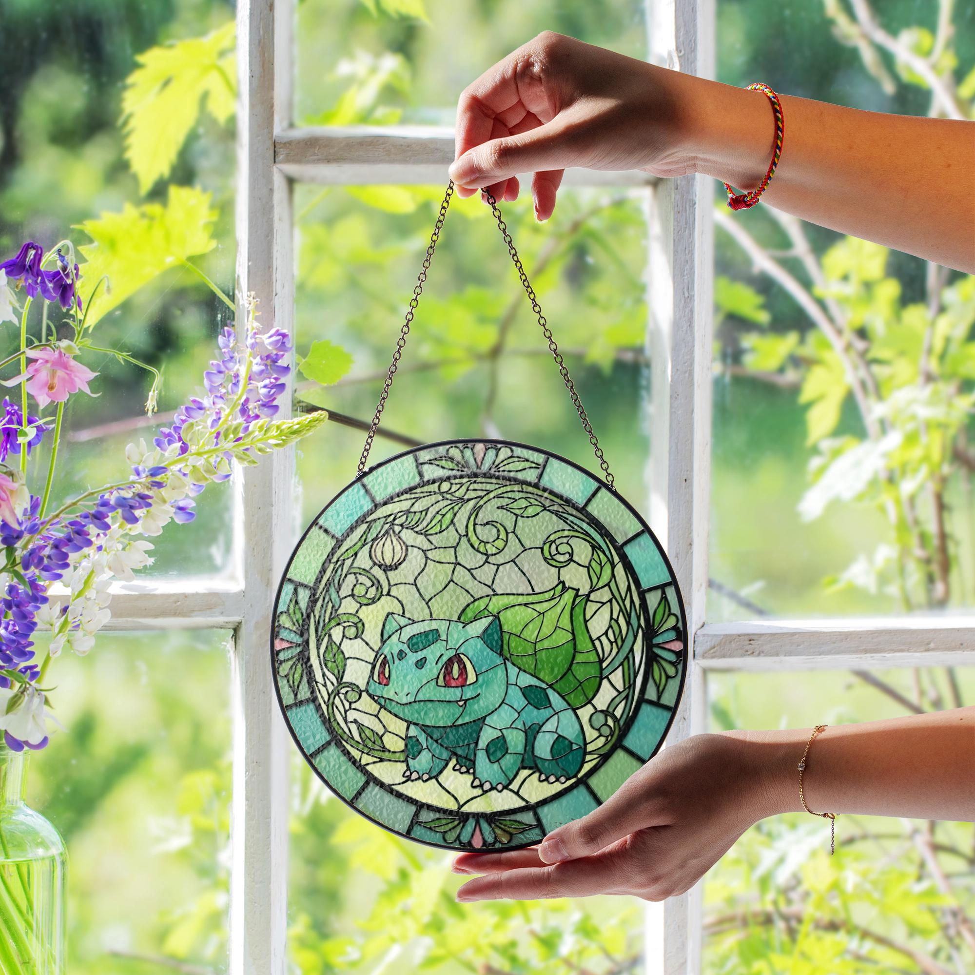 Bulbasaur Stained Glass Suncatcher, Floral Anime Decor