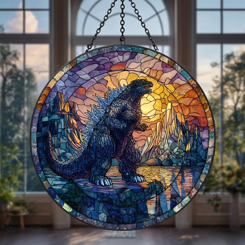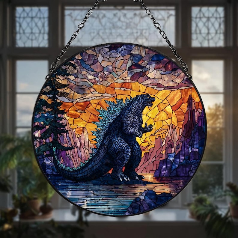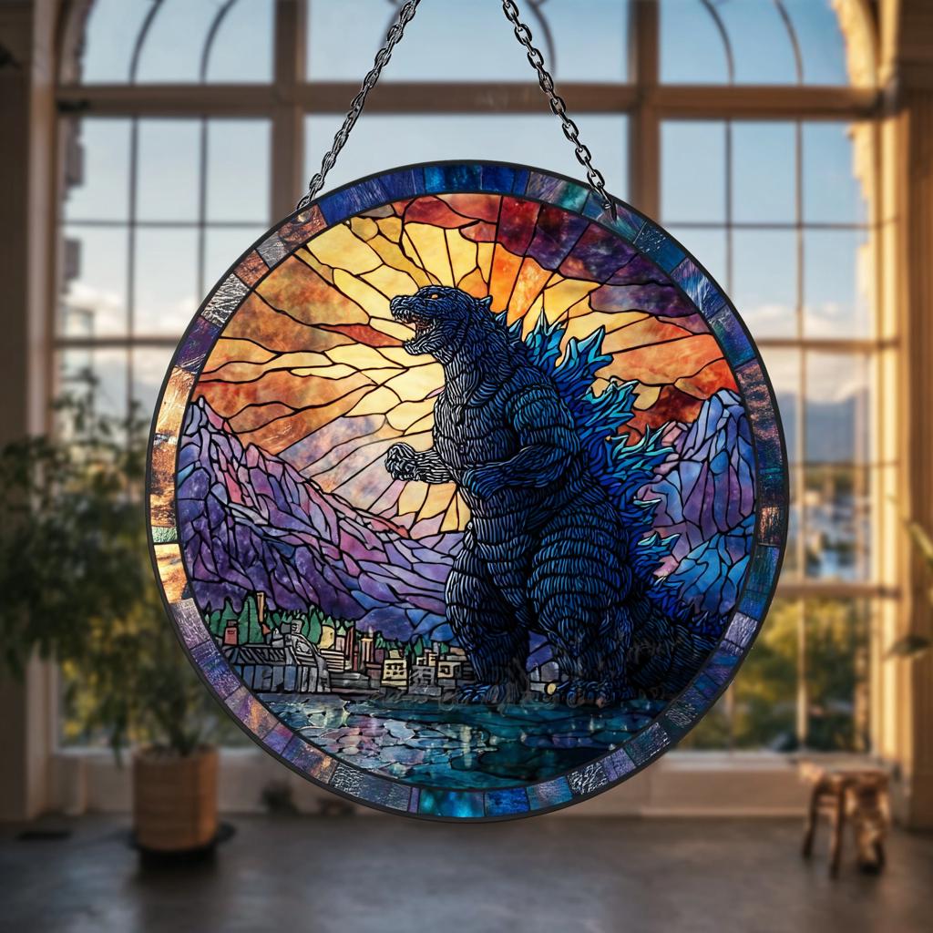 Godzilla Fan Art Ornament, Autumn Foliage Window Decor, Monster Movie Gift For Him, Acrylic Stained Glass Pattern, Unique Gamer Gift