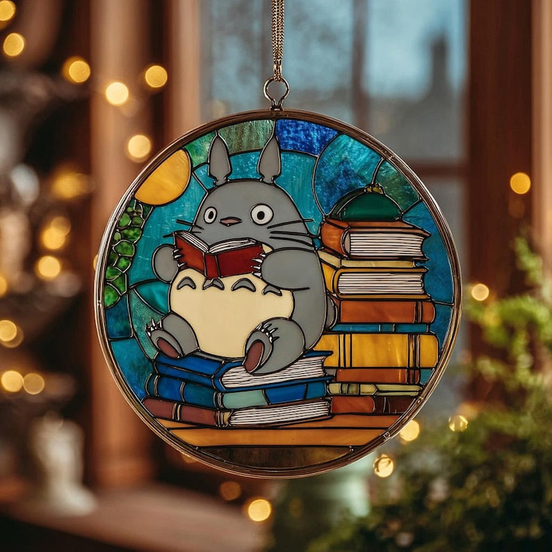 Totoro Reading Glass Suncatcher, Stained Glass Anime Window Art, Studio Ghibli Gift, Bookish Home Decor